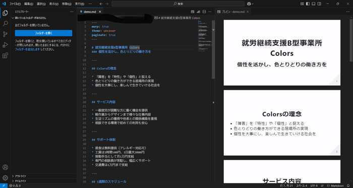 Marpという形式にするとプレゼン資料として扱えるようになります。