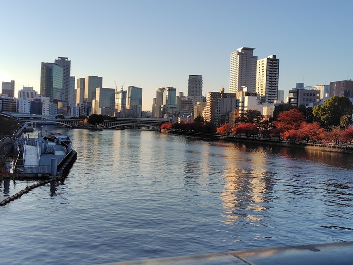 そのあと天満橋に移動し、大川から紅葉を眺めると同じ景色なのに水辺からの